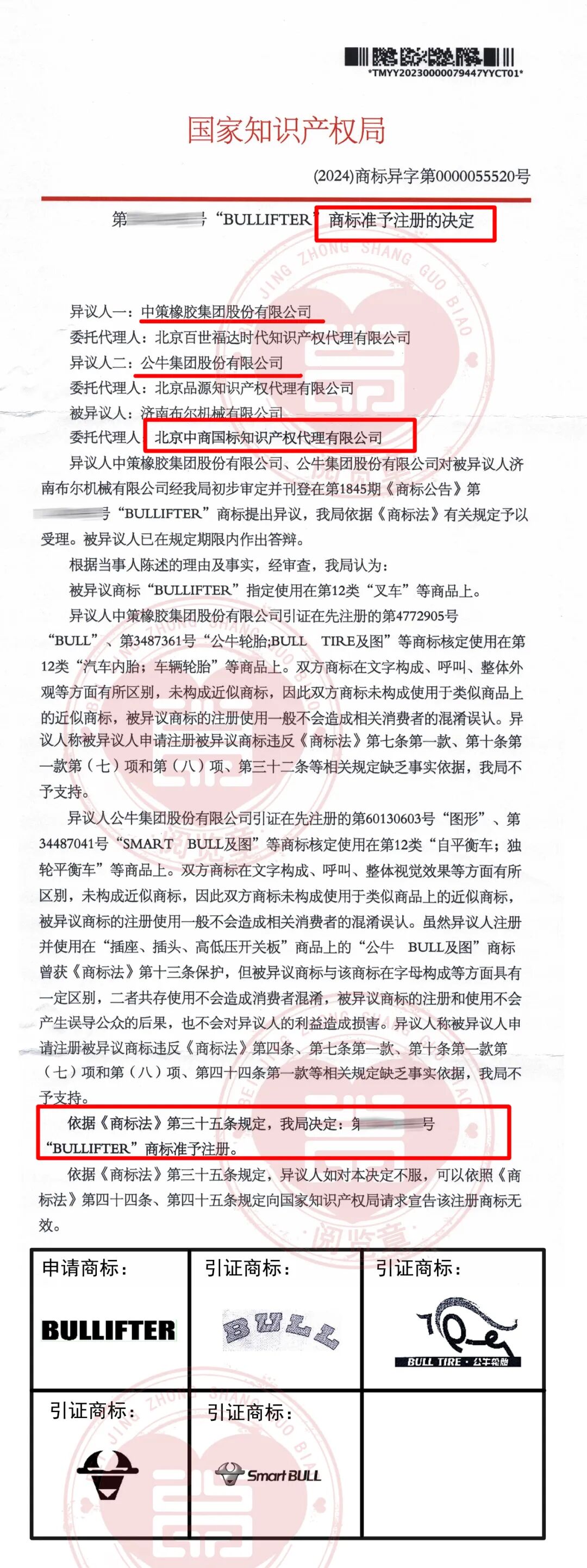恭喜“BULLIFTER”商标异议答辩成功——引证公司“公牛集团股份有限公司”和“中策橡胶集团股份有限公司”
