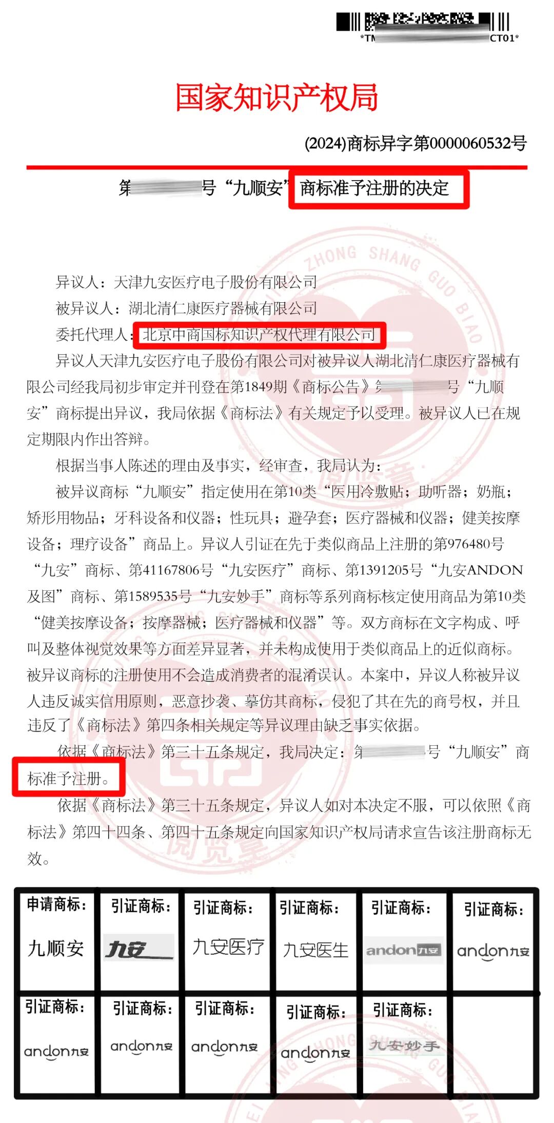 我司北京中商国标知识产权代理有限公司受申请人(以下简称为“答辩人”)委托,根据《商标法》和《商标法实施条例》的相关规定,就商标局关于“九顺安”(以下简称为“被异议商标”)《异议答辩通知书》及天津九安医疗电子股份有限公司(以下简称为“异议人”)的《商标异议书》副本,根据异议人的陈述,最终准予注册。 ![]() ![]() 准予注册
