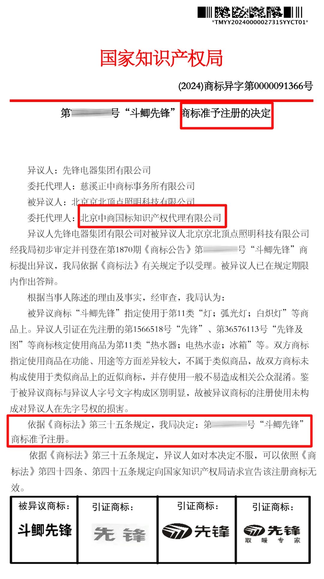 恭喜“斗鲫先锋”商标异议答辩成功——引证商标“先锋”