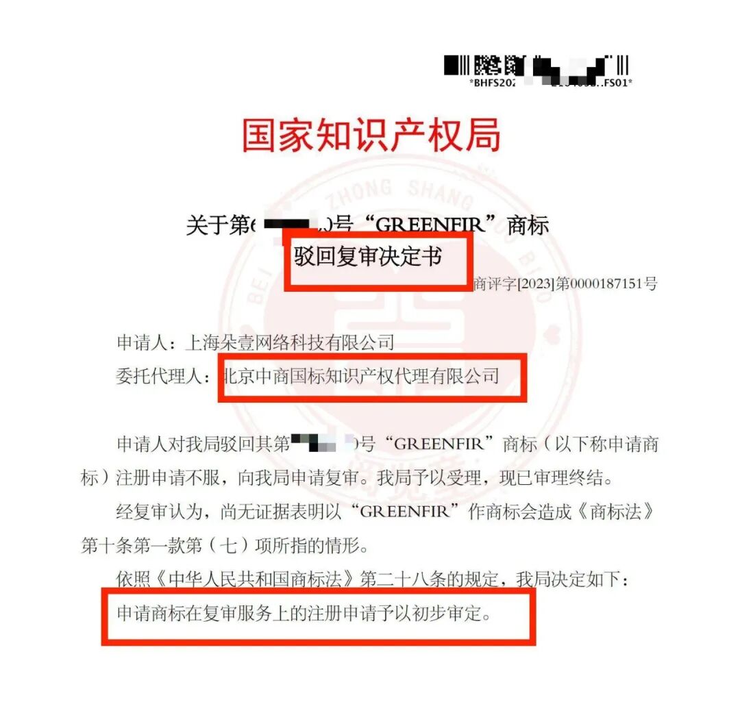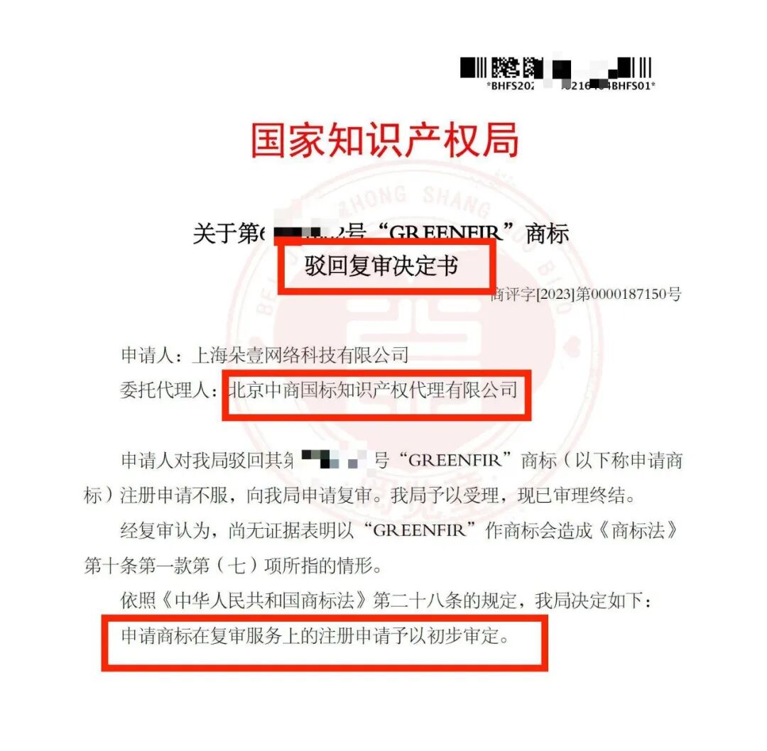 恭喜“GREENFIR”驳回复审成功——申请人上海朵壹网络科技有限公司