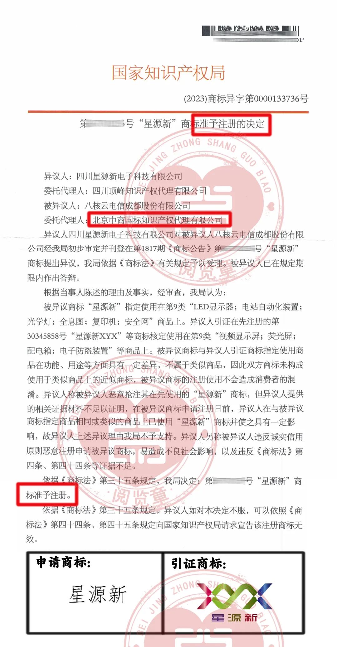 恭喜“星源新”商标异议答辩成功——引证商标“星源新 XYX”