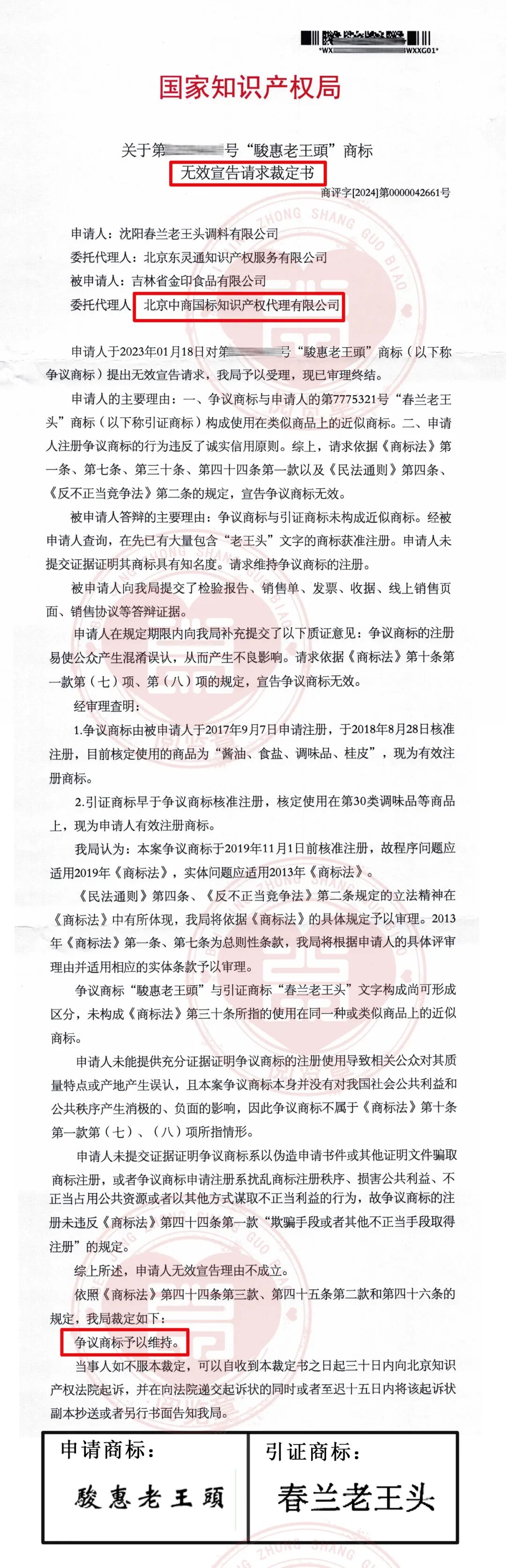 恭喜“骏惠老王头”商标无效宣告答辩成功——引证商标“春兰老王头”