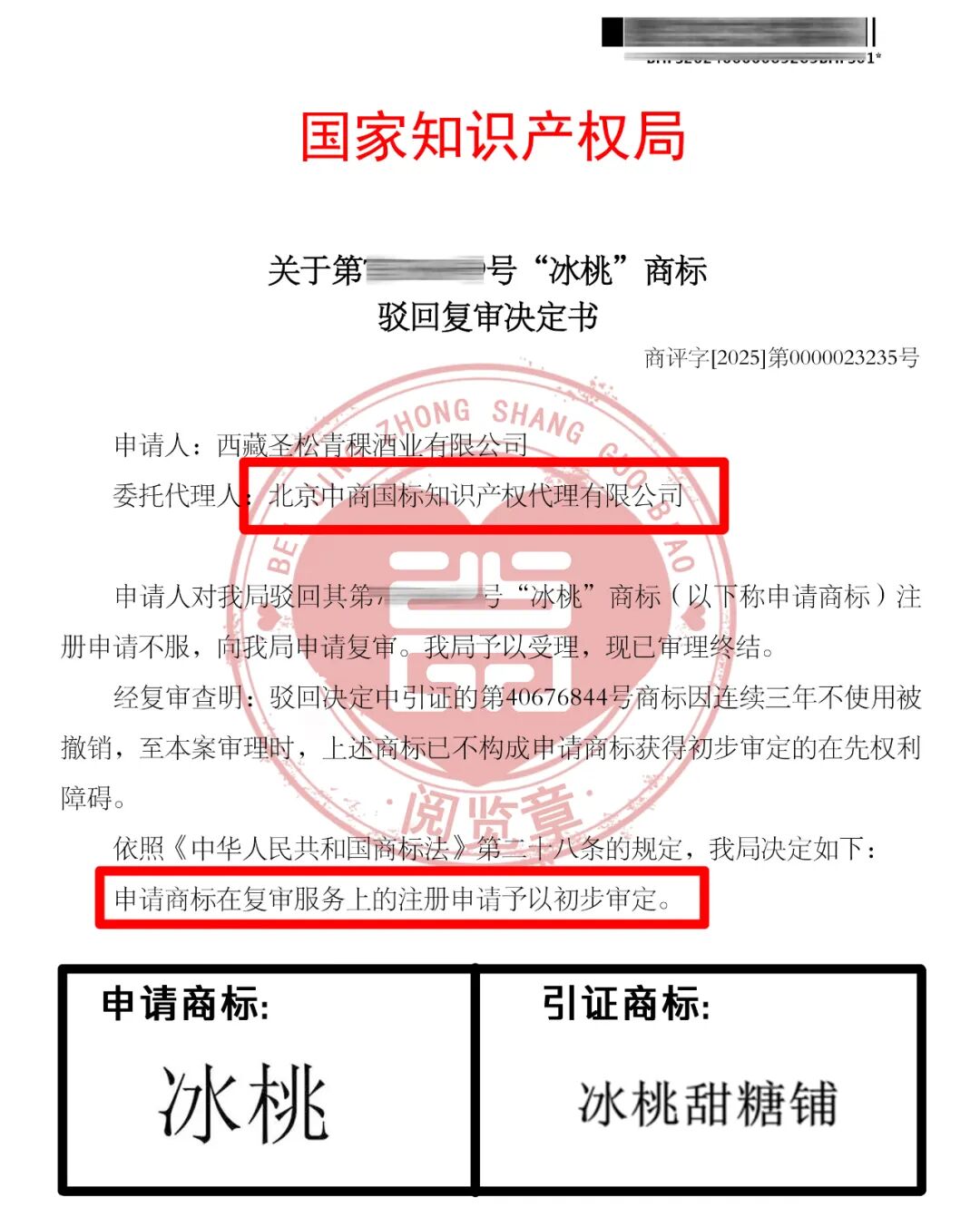 恭喜“冰桃”驳回复审成功——引证商标“冰桃甜糖铺”